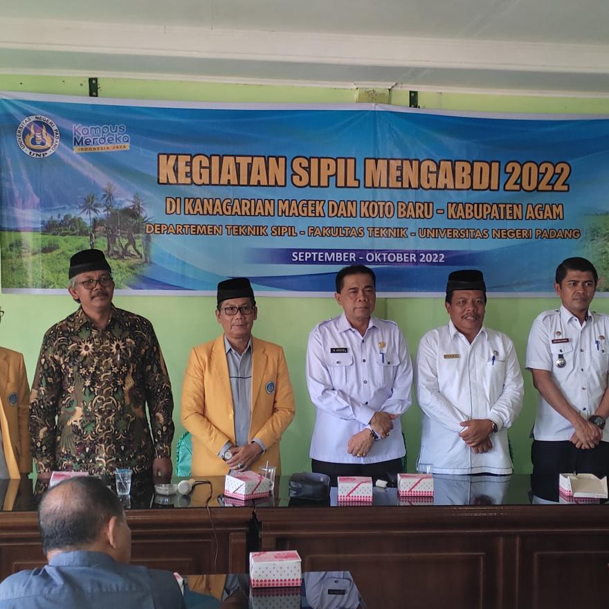 Tim Teknik Sipil UNP laksanakan pengabdian masyarakat di Kanagarian KotoBaru Kabupaten Agam. Bentuk pengabdian berupa pengukuran topografi dan sondir ini dilakukan untuk pembangunan  Gedung Healty Center . Kegiatan yang melibatkan 5 orang dosen (Faisal Ashar, Ph.D, Dr. Nurhasan syah, M.Pd, Dr. Eng. Nevy Sandra, M.Eng, Ridwan Fitra, MT, dan Youmal Arbi, M.T) ini juga diikuti oleh 5 teknisi (Ari Wahyudi, ST, Adetiyawarman Nazwar, A.Md, Akhyar Jamil Nurman, S.Pd, ST, MT, Ilham Wahyudi, A.Md, Akbar Kurnia, ST), 3 asdos (Nazmi Septiani, S.Pd, Dellasri Anisah, A.Md, Majid Maulana, ST), sekaligus serah terima RAB Pembangunan yang di adakan ada Rabu/19 Oktober 2022 selebihnya mahasiswa. Menurut kepala departemen teknik sipil Bapak Faisal Ashar, Ph.D bahwa kegiatan berjalan sukses dan lancar, serta semoga kedepan kegiatan pengabdian lebih banyak lagi.