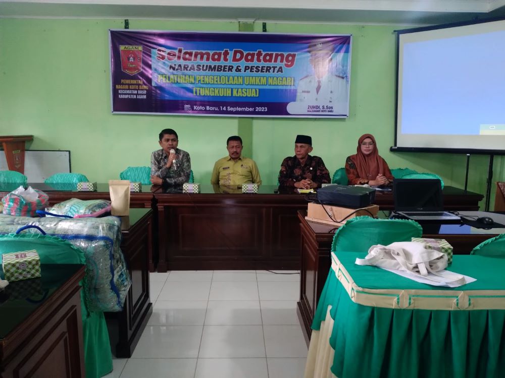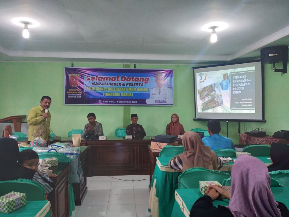 Kamis, tanggal 14 September 2023 telah dilaksanakan Pelatihan Pengelolaan Kelompok UMKM dengan narasumber Kepala Dinas Koperasi dan UKM Kabupaten Agam Bapak Drs. Dedi Asmar yang dihadiri oleh Camat Baso Bapak Rio Eka Putra,S.IP, M.Si, Walinagari Koto Baru Bapak Zuhdi,S.Sos dan para peserta pelatihan UMKM Nagari Koto Baru yang dilaksanakan di Aula Kantor Walinagari Koto Baru.