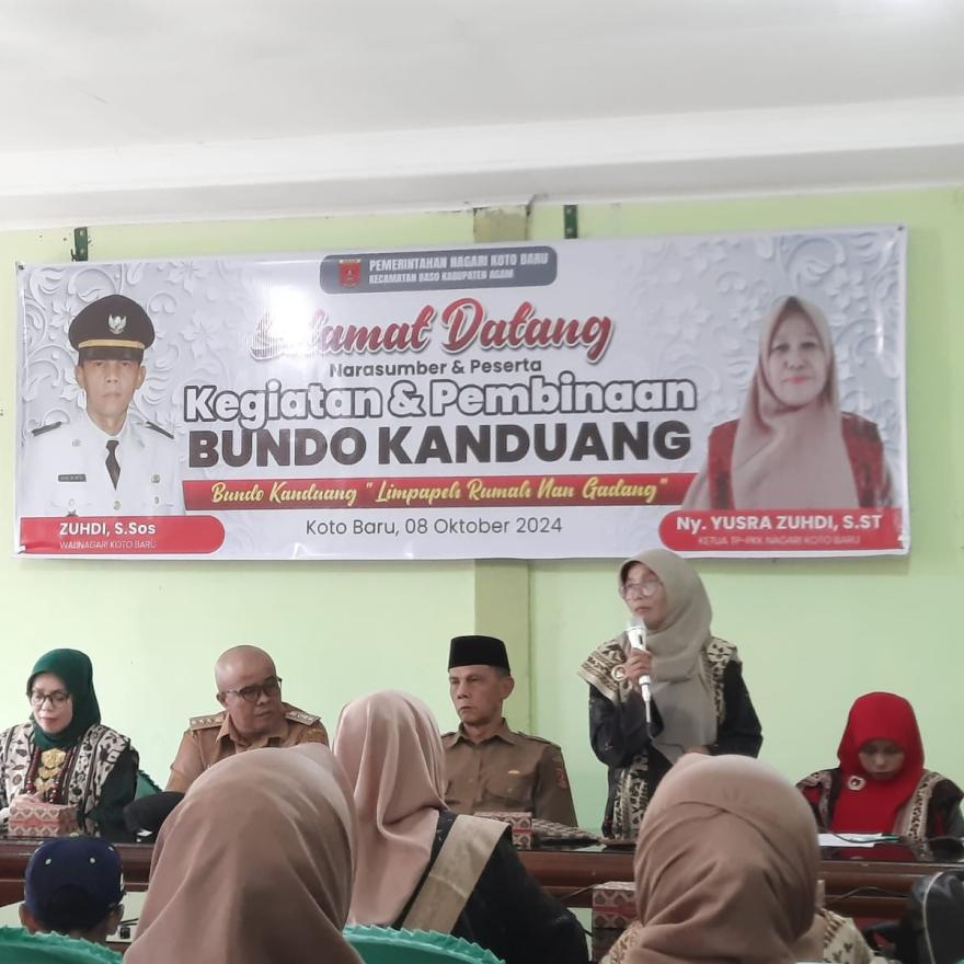 Dalam kesempatan ini Walinagari Koto Baru Bapak Zuhdi,S.Sos berharap kegiatan ini dapat bermanfaat bagi Bundo Kanduang Nagari Koto Baru. Camat Baso Bapak Imran Pangaduan,S.Sos sebagai payung panji di kecamatan membuka kegiatan ini secara resmi sekaligus menyampaikan bahwa kegiatan-kegiatan ini sangat perlu dilakukan karena tanggung jawab terbesar pembinaan anak kemenakan dan puti bungsu, serta adat, etika untuk generasi muda yang sejalan dengan adat dan agama untuk mendidik generasi yang akan datang menuju generasi emas 2045 merupakan peran dan tanggung jawab bundo kanduang.