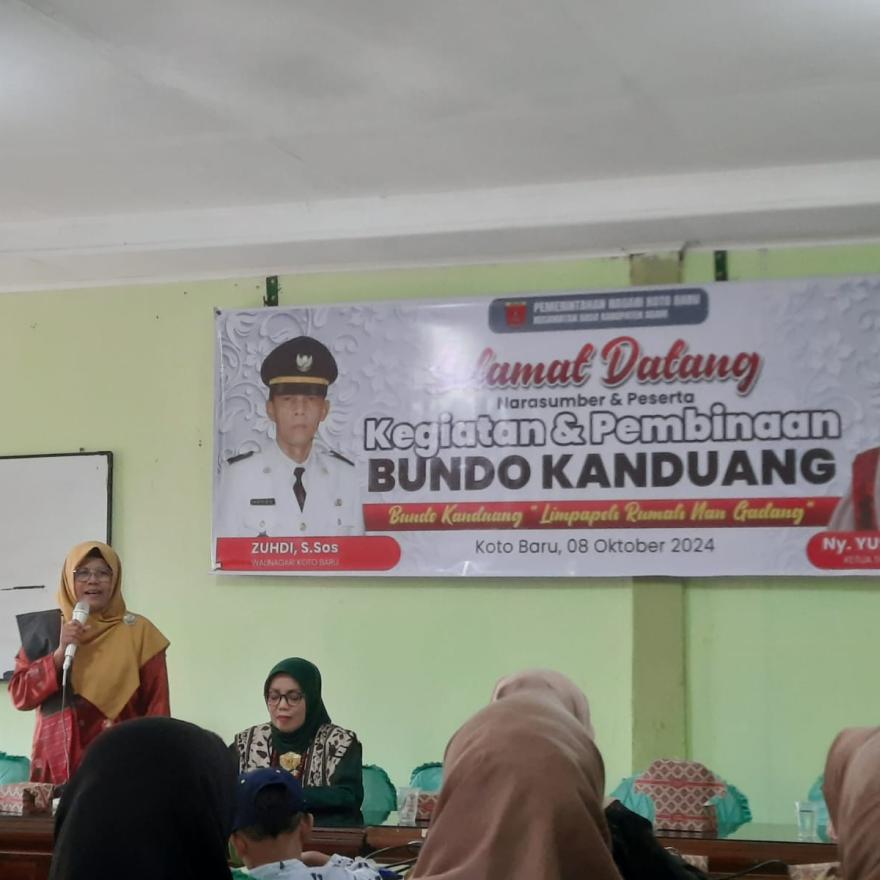 Pada sambutannya Ketua Bundo Kanduang Nagari Koto Baru Bundo Yurnalis,S.Pd mrenyampaikan uraian singkat tentang kegiatan bundo kandung Nagari Koto Baru dalam 2 tahun terakhir termasuk kegiatan pelatihan, pembinaan adat dan budaya di nagari, pertemuan bulanan bundo kandung dan diharapkan dengan adanya pembinaan bundo kandung dari kecamatan dan kabupaten ini dapat memberi banyak manfaat dan masukan untuk bundo kandung di Nagari Koto Baru.