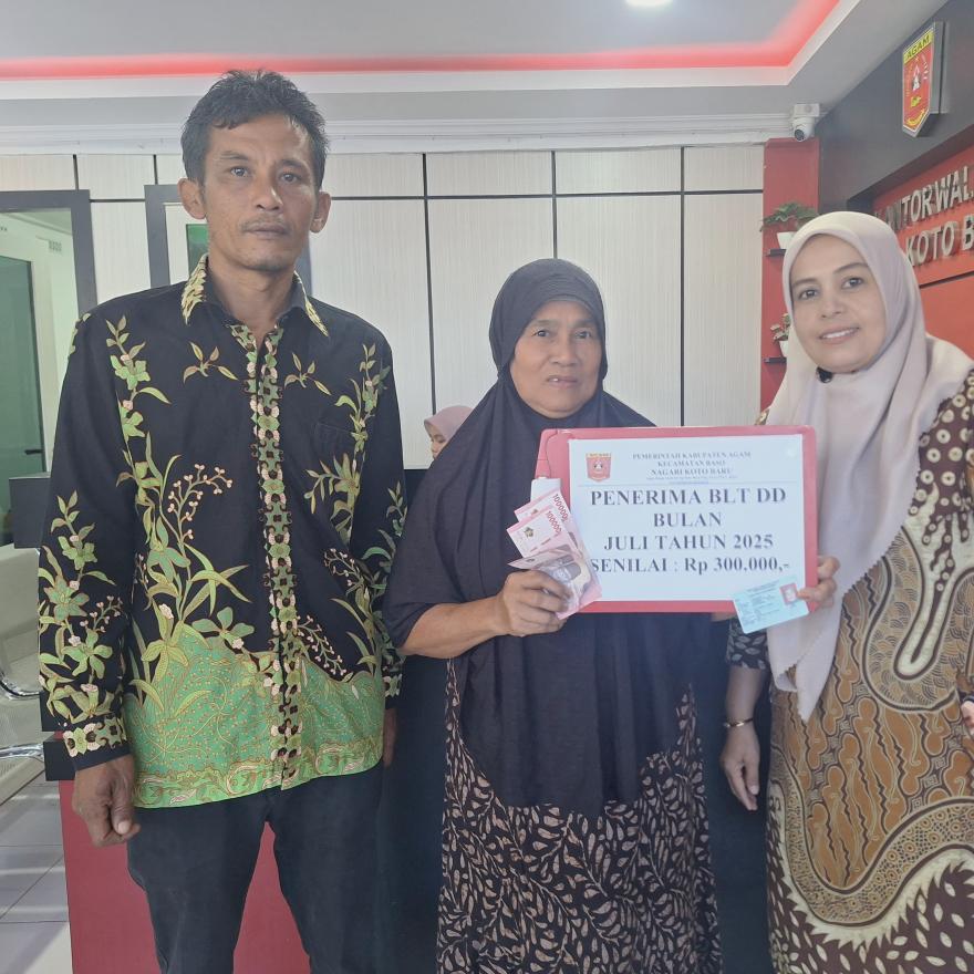 Pada hari Kamis tanggal Tiga bulan Juli tahun Dua Ribu Dua Puluh Lima, telah diserahkan BLT-DD untuk bulan Juli kepada keluarga penerima manfaat dalam rangka penanganan kemiskinan di Nagari Koto Baru senilai Rp. 300.000,- (tiga ratus ribu rupiah) sebanyak 41 KPM sebagaimana dengan bukti daftar tanda terima terlampir.