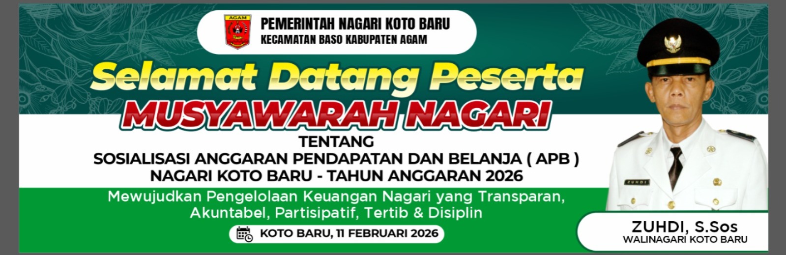 Pada hari Rabu tanggal Sebelas bulan Februari tahun Dua Ribu Dua Puluh Enam di Aula Kantor Walinagari Koto Baru Kecamatan Baso Kabupaten Agam, telah dilaksanakan Musyawarah Nagari yang dihadiri oleh Forkopinca, PD/PLD, Bamus, Unsur-unsur Lembaga Nagari, Tokoh Masyarakat dan Pemuda/i Nagari Koto Baru sebagaimana tercantum dalam lampiran daftar hadir .